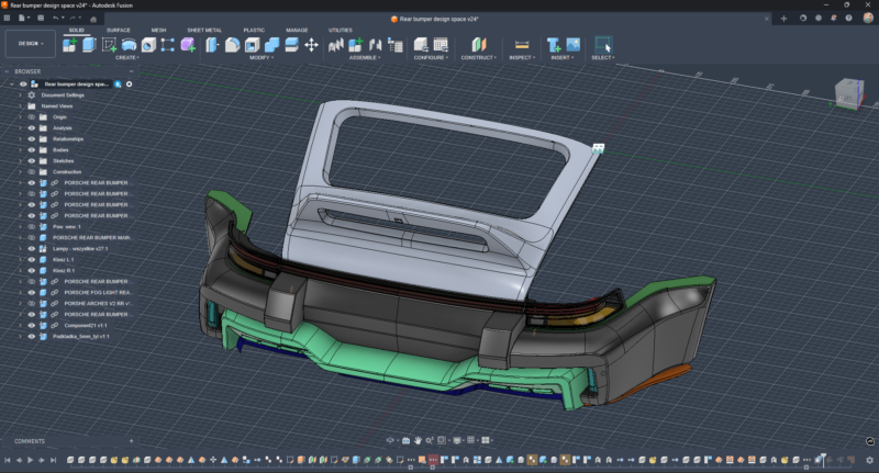Nasza praca przebiegała w oprogramowaniu Fusion 360 na zasadzie free-form (T-splain), często z użyciem projektowania generatywnego. W przypadku konstrukcji montażowej tunelu środkowego istniejące na skanie 3D i zaznaczone punkty montażowe połączyliśmy właśnie tą metodą – automatycznie.